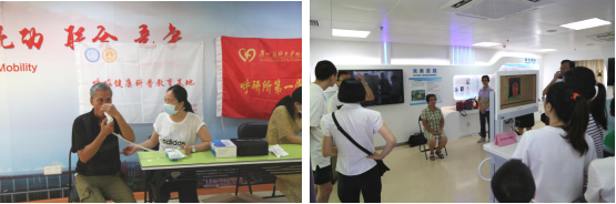 讲座后,市民们参与了基地科普体验互动活动:肺功能检查和实验室产学研转化成果之“红外热成像检测仪”。让市民了解到肺功能检查是呼吸系统疾病的必要检查之一,对于早期检出肺、气道病变等疾病有着重要的价值;红外热成像仪则是利用热成像技术,在可见光图像中显示被测目标的温度及其分布,从而发现人体各种组织、器官的炎症和血管病变及肿瘤等疾病。