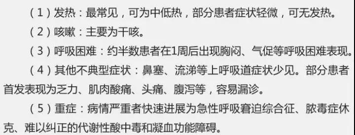 2.临床表现 :(1)发热; (2)具有上述肺炎影像学特征;(3)发病早期白细胞总数正常或降低,或淋巴细胞计数减少。