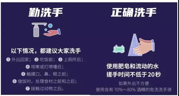 2.保持手卫生2019-nCOV通过飞沫和接触传播。注意咳嗽、喷嚏时使用纸巾或屈肘遮掩口鼻,防止飞沫传播。不要打完喷嚏后揉眼睛或者接触其他粘膜部位。最新报道的美国病例,患者的粪便、上呼吸道样本、鼻咽和口咽拭子检测2019-nCoV均呈阳性,广州确诊病例家中门把手查出病毒核酸,提示我们一定重视加强手卫生!咳嗽、饭前便后、接触或处理宠物粪便后,要用流动的水洗手,或者使用含酒精成分的免洗洗手液。科学正确的保证手卫生可有效将接触感染的风险降到最低。