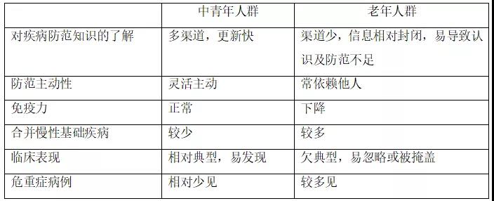 此次新型冠状病毒起病隐匿、潜伏期长、首发症状多样且不典型。发热为主要表现,可合并轻度干咳、乏力、呼吸不畅、腹泻等症状,流涕、咳痰等卡它症状少见。但是,部分患者可无发热、咳嗽,可表现为乏力、胸闷或消化道症状等临床症状,特别是老年人的临床表现更不典型,个别患者有可能以谵妄,意识障碍等症状为首发或早发症状,因此不易早期发现、早期诊断和干预治疗,导致死亡率增加。另外,在当前以互联网作为信息获取渠道的主流时代,相较于中青年人群,老年人群往往无法获得及时和足够的信息更新,造成对该新发疾病防范的认识及重视不足,防范意识薄弱,增加了受感染以及疾病传播的风险。因此,对于老年人群更需要加强对该疾病的认识和防护。