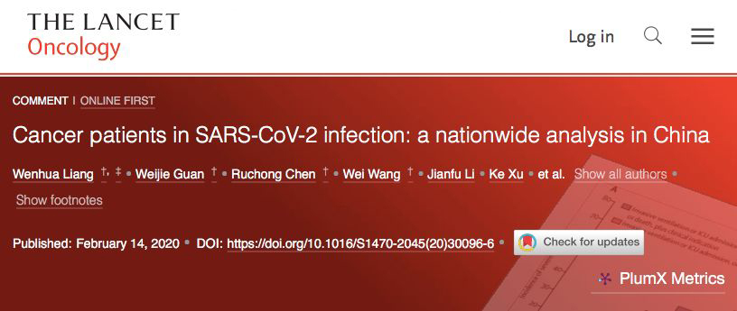 2020-02-1934962019年12月,中国湖北省武汉市发生了一系列急性呼吸道疾病,现在称为新型冠状病毒肺炎,该疾病已从武汉迅速传播到其他地区。2020年2月14日,广州医科大学何健行团队在癌症领域国际顶级期刊Lancet Oncology 在线发表题为“Cancer patients in SARS-CoV-2 infection: a nationwide analysis in China”的述评。