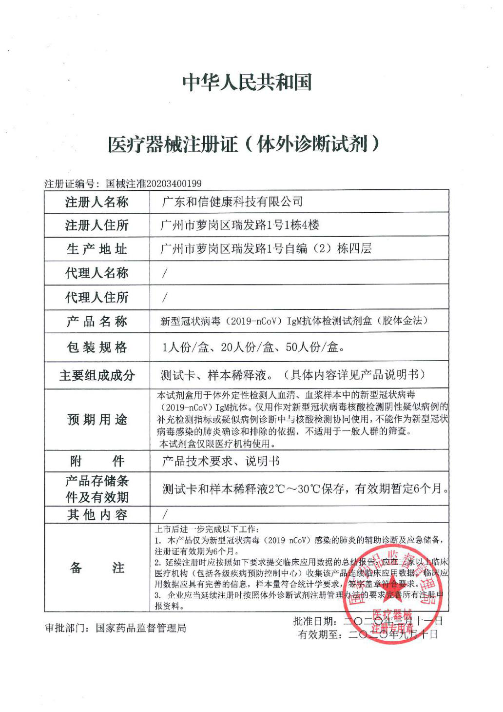 2020-03-1256313月11日,由实验室、广州再生医学与健康广东省实验室、中国科学院广州生物医药与健康研究院、广东和信健康科技有限公司、广州恩宝生物医药科技有限公司五所单位通力合作研发的“新型冠状病毒(2019-nCoV)IgM抗体检测试剂盒(胶体金法)”通过国家药监局审批,获得三类医疗器械注册证(国械注准20203400199)。该项目的研发,得到了科技部、广东省科技厅、广州市及广州开发区科技局的支持。
