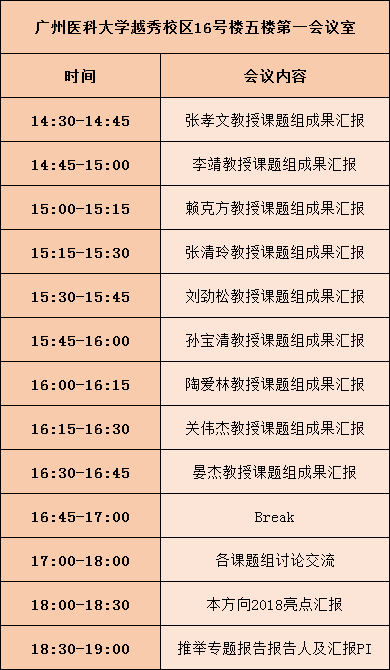 2018-12-261848根据实验室2018年度年终总结的总体进程安排,支气管哮喘和慢性咳嗽研究方向定于2018年12月29日14:30-19:00在广州医科大学越秀校区16号楼五楼第一会议室召开年度专题报告会。