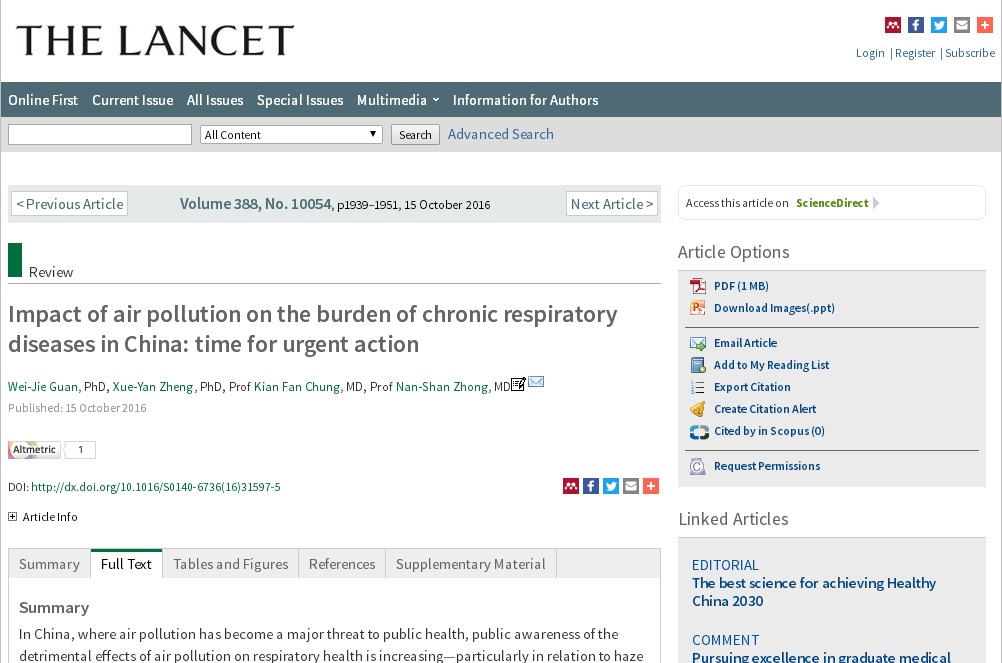 据悉,本文的团队成员包括关伟杰博士(第一作者)、郑雪燕博士(广东省疾病预防与控制中心)、英国Imperial College London的著名呼吸科教授Kian Fan Chung以及钟南山院士(本文的通讯作者)。文章题录:Guan WJ, Zheng XY, Chung KF, Zhong NS. Impact of air pollution on the burden of chronic respiratory diseases in China: Time for urgent action. Lancet. 2016; 388: 1939-51。本文的发表是我国呼吸病学与环境科学大协作的开端,今后呼吸疾病国家重点实验室将连同更多的兄弟院校及单位申办空气污染防治的国家重点实验室,以将我国的环境科学与呼吸病学研究推向更高的平台。