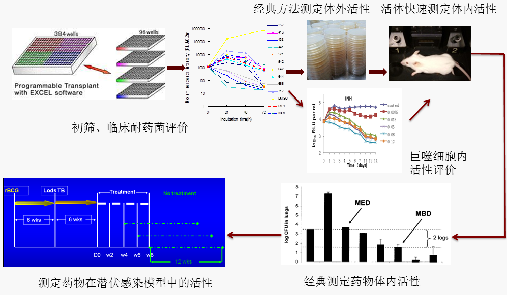 本研究组已经利用该类发光菌建立了高效的完整的抗结核药物筛选评价平台(图2),与我院内外多个课题组合作,包括澳大利亚的CSIRO,筛选了4万多个化合物并进行了不同阶段的研究。目前已获得近十个具有体内抗结核活性的化合物,申请了3个专利。