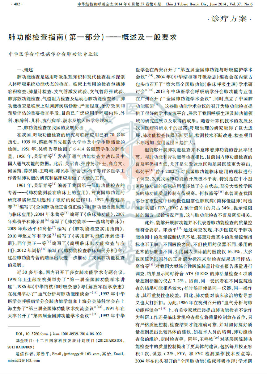 为进一步引起大家对肺功能检查及其质量控制的关注,促使我国肺功能检查技术的普及和规范,实验室郑劲平教授组织中华医学会呼吸病学分会肺功能专业组的全体委员集体讨论起草了我国首部《肺功能检查指南》。该系列指南包括8个部分和1个附录,(1)肺功能检查概述及一般要求;(2)肺量计检查;(3)支气管激发试验;(4)支气管舒张试验;(5)肺弥散功能检查;(6)肺容积检查;(7)气道阻力检查;(8)肺功能检查项目的合理选用。附录:肺功能检查常用缩略语及其中英文名称。其他检查如六分钟步行试验、呼出气一氧化氮浓度检查、运动心肺功能检查、呼吸振动成像检查等部分,将根据实际情况适时增补和推出。该系列指南从2014年6月起,由《中华结核和呼吸杂志》逐期刊发。