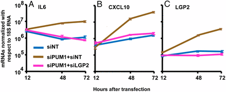 本研究首次揭示Pumilio1(Pum1)这一众所周知的RNA结合蛋白透过LGP-2对天然免疫进行动态的负调节。Pum1为PUF家族中的一种RNA结合蛋白,在生物学进化过程中高度保守,通过对其靶蛋白mRNA的翻译抑制调控而发挥生物学功能。本研究的创新之处在于发现PUM1这个传统蛋白具有阶段性地调节天然免疫的新功能:Pumilio1 的敲减可瞬间激活LGP2,再由LGP-2引发RIG-I、MDA5等一系列宿主基因的不同时段性的上调激活,引发β型干扰素 (IFN-β)的分泌释放,利用本研究组已有的HSV细胞感染模型,发现病毒的复制被明显抑制。