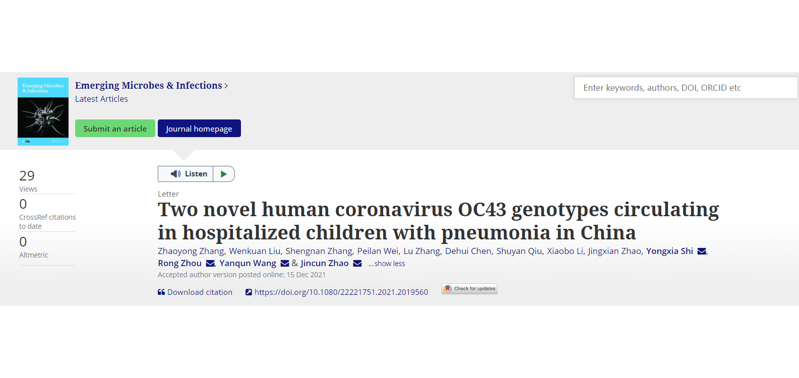 实验室赵金存教授团队在住院患儿中发现冠状病毒OC43新基因型